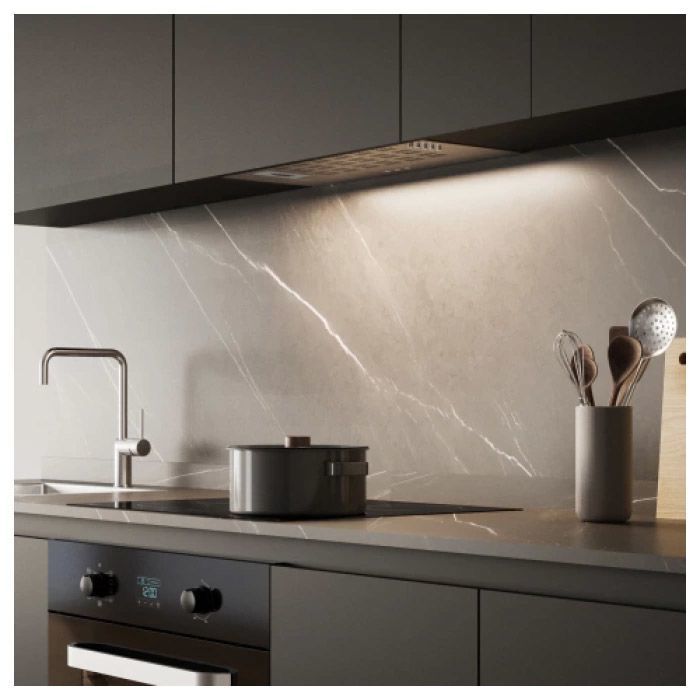 Motor interno 6 de bajo nivel sonoro. Comando pulsante. Iluminacion tecnologia led. Acabado acero inoxidable esmerilado. Cubre cano no incluido. Filtro metalico lavable. Especificaciones tecnicas: extraccion 800 m3h con salida libre. Velocidades 3. Ancho 530 mm. Opcional: filtro carbono activado sin...