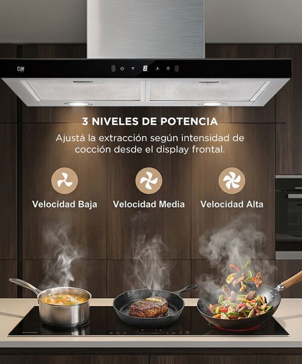Extracción potente para eliminar humo rápidamente: La Campana Extractora CUK SIL ofrece un flujo de aire de 750 m³/h, ideal para eliminar vapores y olores en cocinas domésticas exigentes. Su motor de 230W garantiza rendimiento constante incluso en máxima velocidad. Control táctil y sensor de mano in...