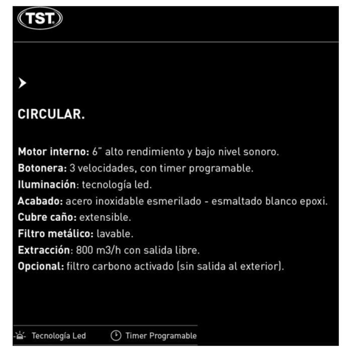 Motor interno 6 de bajo nivel sonoro. Comando digital con timer programable. Iluminacion tecnologia led. Acabado acero blanco. Cubre cano extensible. Filtro metalico lavable. Industria nacional.