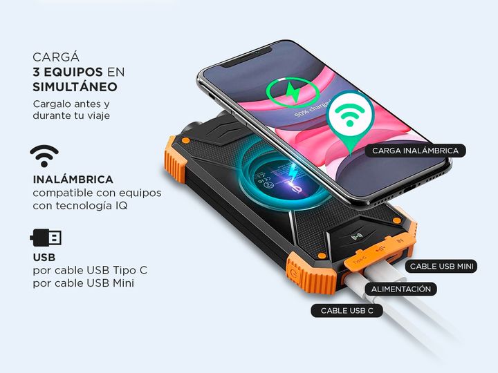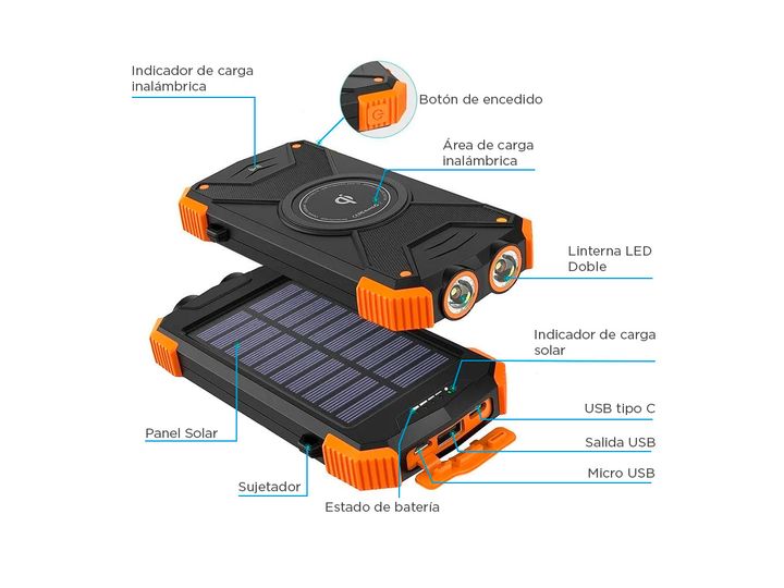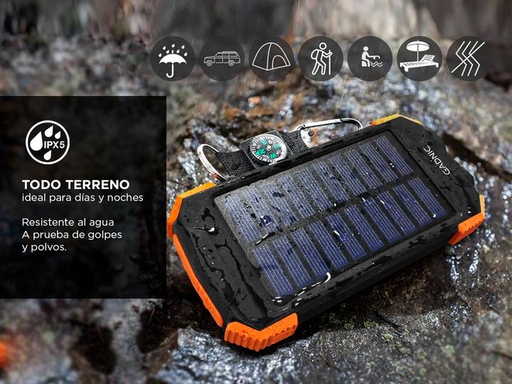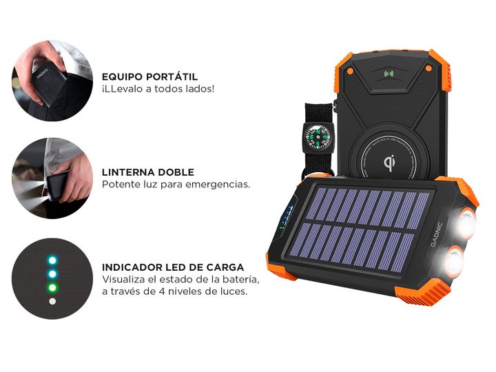 ¡Nuevo cargador de batería portátil inalambrico 10000 mah! El nuevo cargador de batería por energía solar es ideal estar siempre listos, incluso en días y noches al aire libre o de aventura. No importa donde estés, este power bank tomará energía del sol para cargar tus artefactos en casos de emergen...