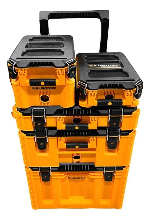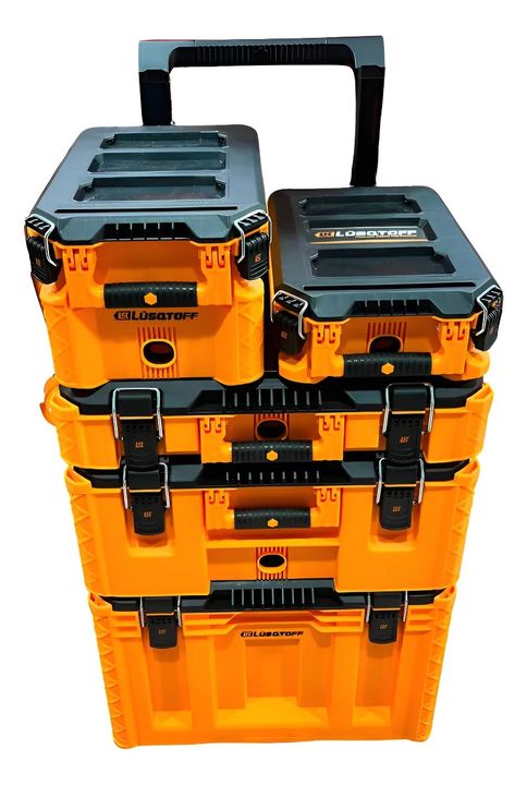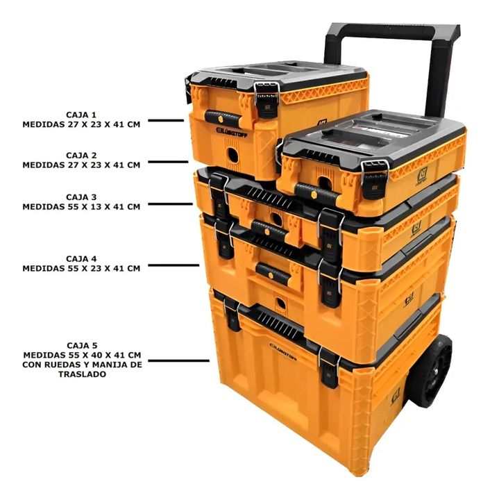 CAJA HERRAMIENTAS CARRO APILABLE LUSQTOFF 5 CAJAS LCHP6-8 • Conformado por 5 cajas apilables para máxima versatilidad y orden. • Capacidad de carga de hasta 120kg, soportando labores exigentes. • Equipado con ruedas para fácil desplazamiento y movilidad sin esfuerzo. • Diseño resistente al agua y al...