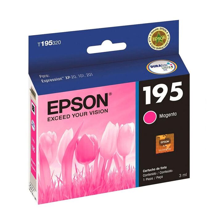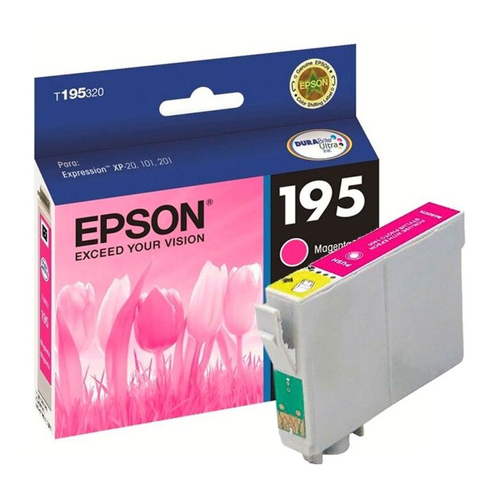 Cartucho de Tinta Epson T195 Magenta Original - T195320-AL Las tintas DURABrite Ultra ofrecen una calidad de imagen muy superior y además son resistentes al agua, la luz y los borrones, para así garantizar un color parejo y duradero. Son ideales para impresión en ambos lados del papel ya que las tin...