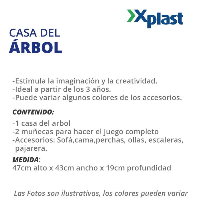 CASA DE MUÑECAS X-PLAST CON MUEBLES Y ACCESORIOS CASA DEL ÁRBOL * Estimula la imaginación y la creatividad * Los acerca jugar con otros niños * Ideal para los más pequeños, a partir de los 3 años * Puede variar el color del techo, puerta , muñecas y accesorios LA OFERTA INCLUYE -1 casa del arbol -...