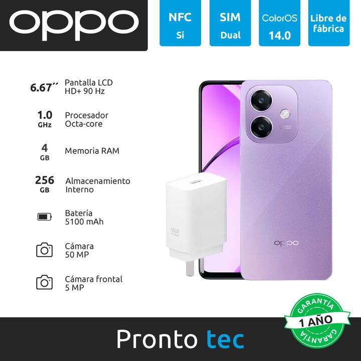 CARACTERÍSTICAS: - Marca: OPPO - Modelo: A40 - Línea: A - Pantalla: 6.67´´ - Tecnología de pantalla: LCD - Resolución: (1604 x 720 px), HD+, 90 Hz - Núcleos del procesador: 8 - GPU: Qualcomm Snapdragon 6s 4G Gen1, 1.0 GHz - Memoria: 4 GB - Almacenamiento: 256 GB - Cámara principal: 50 MP - Cámara fr...