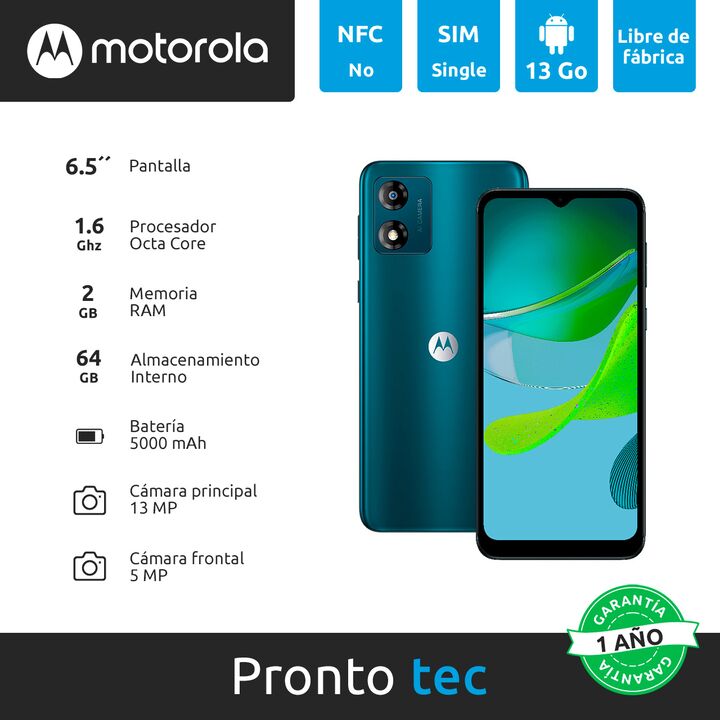 DISEÑO SOFISTICADO Y ESPECTACULAR El moto E13 tiene todo el estilo que estabas buscando. Delgado, liviano y con un diseño sofisticado, es increíble desde donde lo mires. Llevá el cine en tu bolsillo con el audio multidimensional de Dolby Atmos 1 y la pantalla HD+ ultra wide de 6.5. DESEMPEÑO RÁPIDO ...