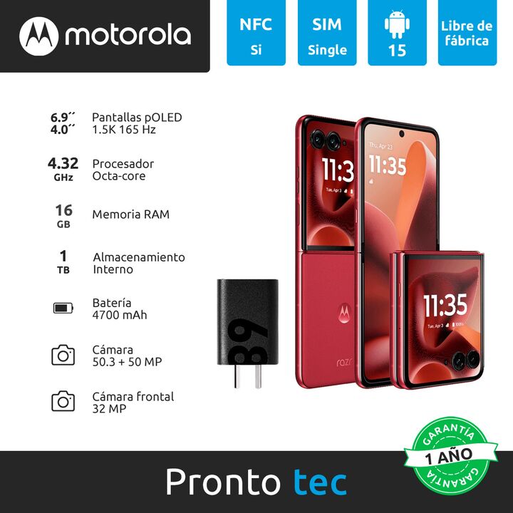 Diseño resistente que inspira La pantalla externa más grande e intuitiva Las cámaras más avanzadas en un plegable Moto Ai: tu vida más fácil y creativa para capturar tus momentos y simplificar tu día a día El procesador más poderoso de la industria Batería para todo el día en 8 minutos La pantalla i...