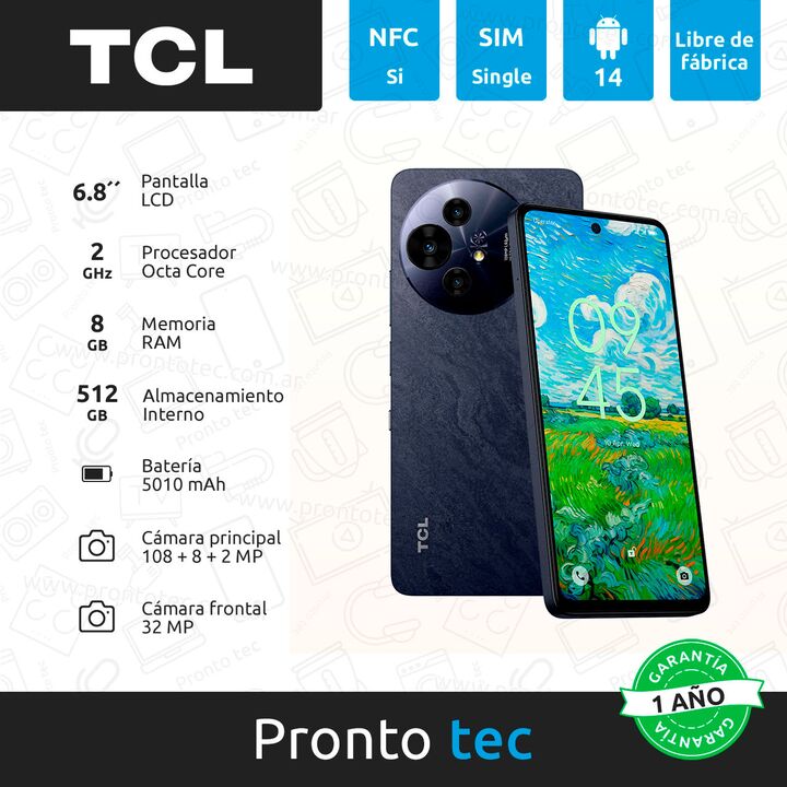 CARACTERÍSTICAS: - Marca: TCL - Modelo: 50 Prox NXT Paper 5G - Pantalla: 6,8´´ FHD+ - Tecnología de pantalla: IPS - Resolución: 720 x 1612 px - Núcleos del procesador: 8 - GPU: Octa-core MTK 24E 2.0 GHz - Memoria: 8+8 GB (Memoria RAM Expansible) - Almacenamiento: 512 GB - Lector de tarjetas de memor...