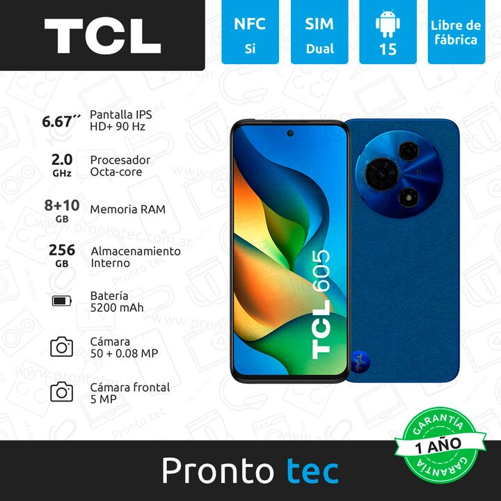 Un aliado para todo el día, el TCL 605 cuenta con una batería de 5200 mAh que te respaldará en cada una de tus actividades diarias. Con 128 GB de memoria interna que te permitirá almacenar toda la información que necesites. Además cuenta con un rendimiento fluido proporcionado por 18 GB de RAM (8 fí...