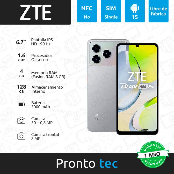 Con una pantalla inmersiva de 6,75 con frecuencia de refresco de 90 Hz, el A56 Pro de ZTE te permitirá tener una experiencia de visualización superior. Una batería de 5000 mAh que te facilita el uso diario y minimiza la frecuencia de cargado. Con un potente procesador de ocho núcleos, que te garanti...
