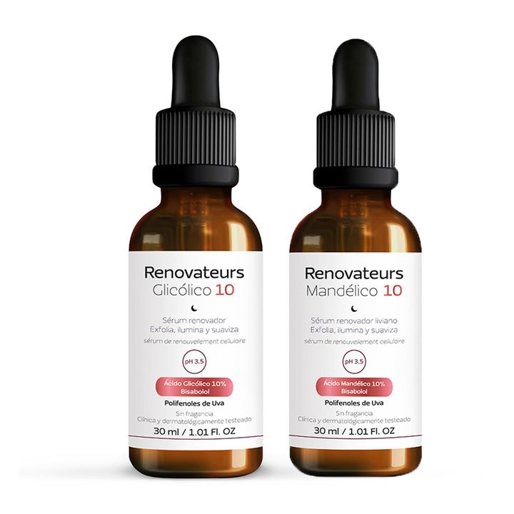 Sérum facial de ácido mandélico al 10% a pH 3,5 + Sérum facial de ácido glicólico al 10% a pH 3,5. Tiene efecto peeling. Exfolia la superficie de la piel, ayudando a suavizar su textura y a fomentar el proceso de renovación cutánea. Ideal para pieles sensibles y con tendencia al acné. El ácido mandél...