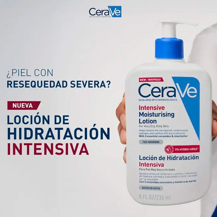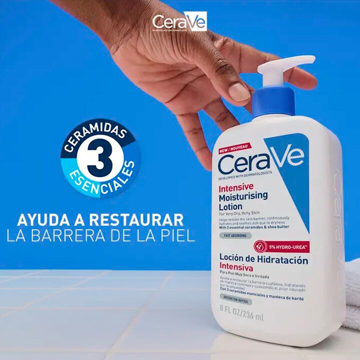 CeraVe Loción Hidratante Intensiva es una crema loción desarrollada con dermatólogos para brindar hidratación profunda y duradera en piel seca a muy seca con comezón por resequedad. Su fórmula avanzada combina Hydro-Urea, un complejo que ayuda a restaurar los factores hidratantes naturales de la pie...
