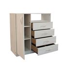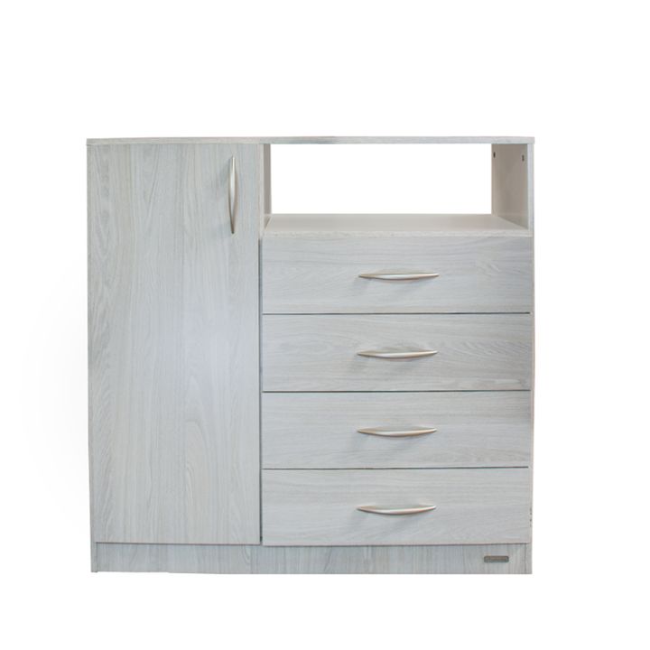 Chiffonier de melamina. Una puerta con bisagras metálicas y dos estantes móviles. Cuatro cajones con correderas metálicas. Tiradores de Pvc. Color Gris Andino. Medidas: Ancho: 1.00 mts. Alto: 1.02 mts. Profundidad: 0.47 mts. Productos Seleccionado para venta y entrega “EN CAJA”.
