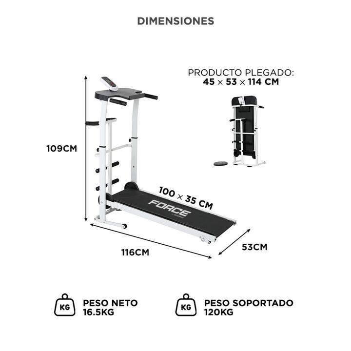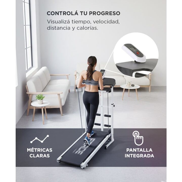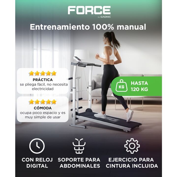 Entrenamiento manual sin consumo eléctrico: La Cinta Caminadora Manual Force by Gadnic funciona sin motor ni enchufe, permitiendo entrenar a ritmo propio mediante el movimiento del usuario. Es una alternativa práctica para caminatas activas y rutinas cardiovasculares en el hogar, con menor mantenimi...