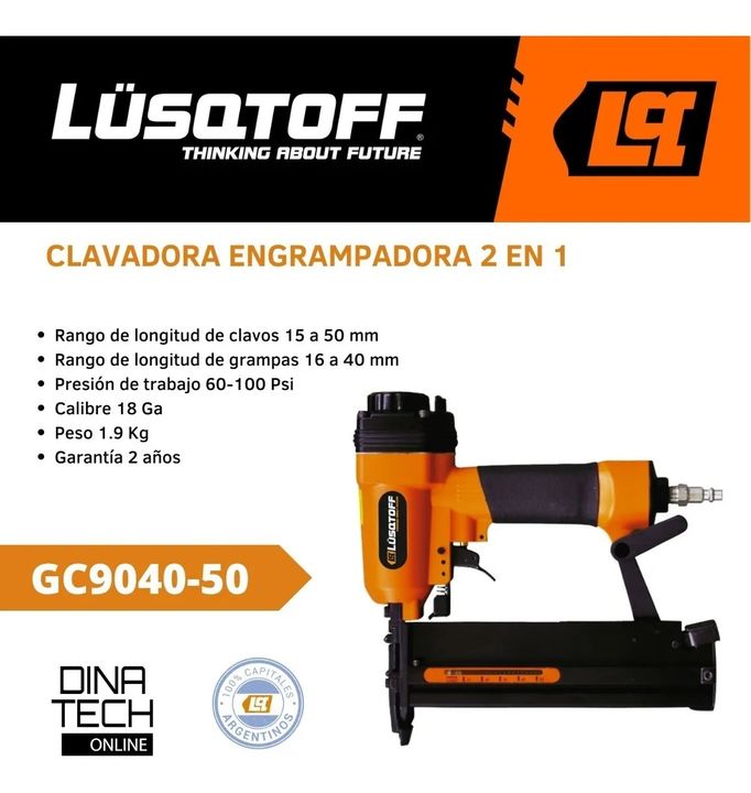 Clavadora Engrampadora Neumatica 2 En 1 Lusqtoff GC9040-50 La clavadora neumática Lusqtoff 2 en 1 es una clavadora de alta resistencia y larga duración diseñada para manejar eficientemente los trabajos de construcción y bricolaje más exigentes. Con una capacidad de carga de 100 piezas, tiene una pre...