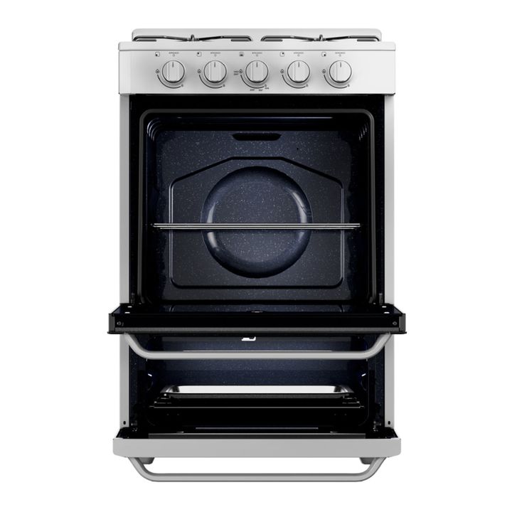 Cocina multigas de 56 cm con 74 litros de capacidad en horno. Color blanco. Cuenta con 2 parrillas superiores de alambrón negro y 1 parrilla en horno cromada. 4 hornallas multitamaños con sensor de flama. Puerta de horno con vidrio panorámico negro. Posee válvula de seguridad, termocontrol en horno ...