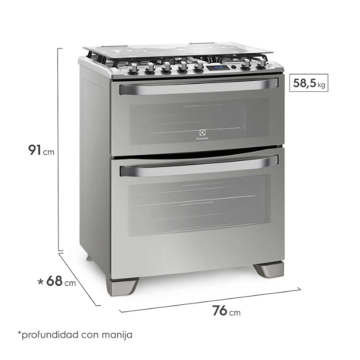 Moderna y segura, la Cocina Doble Horno Electrolux (76DXR) cuenta con dos hornos independientes a gas y un grill eléctrico para que puedas gratinar y dorar preparaciones y darle un toque especial a tus alimentos en el tiempo justo, gracias a su temporizador digital y reloj que facilita el control de...