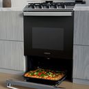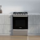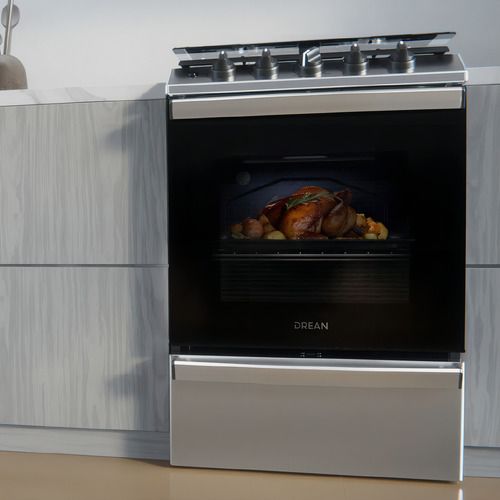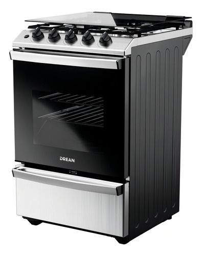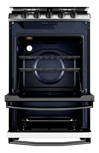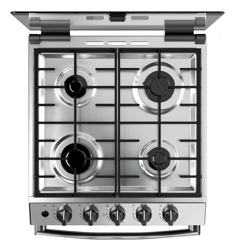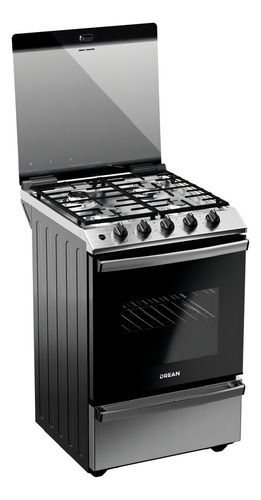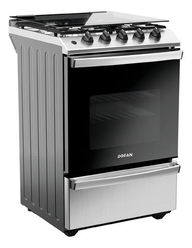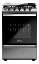 Cocina multigas de 56 cm con 74 litros de capacidad en horno. Color inoxidable. Cuenta con 2 parrillas superiores de fundición y 2 parrillas en horno, 1 estándar y 1 autodeslizable. Capelo recto de vidrio. 4 hornallas con sensor de flama. Puerta de horno con vidrio. Posee válvula de seguridad, termo...