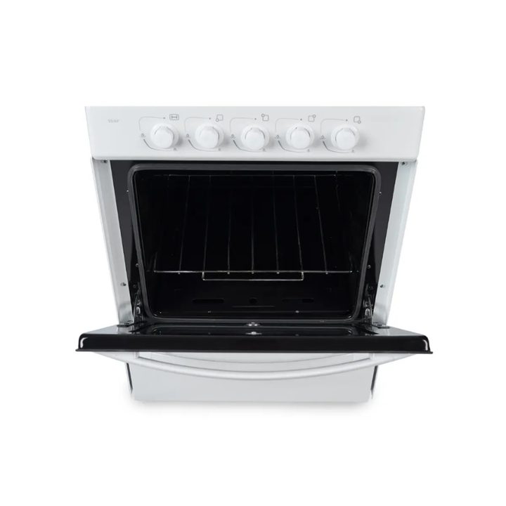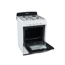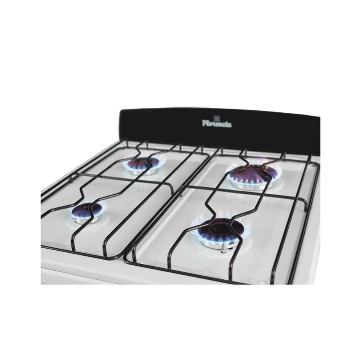 Cocina bigas de diseño clasico con autolimpiante Florencia, color blanca. Cuenta con horno y parrilla Easy Cleaning, rejillas anti vuelco enlozadas, puerta visor de doble vidrio templado con freno y desmontable. Cajón parrilla rebatible.