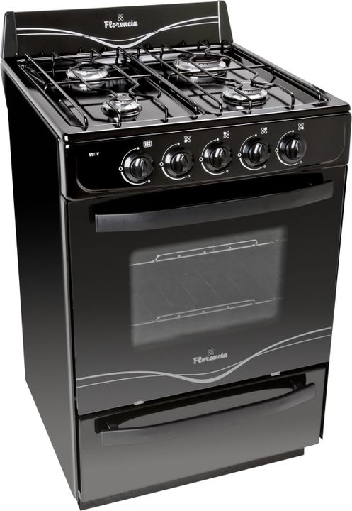 -COCINA 5517F NEGRA BIGAS FLORENCIA -Enlozado Durpox tecnologia de ultima generacion. -Puerta de horno con doble vidrio templado -Valvula de seguridad en horno y hornallas -Con eficiencia energetica clase A -Enlozado de horno facil limpieza -Rejillas anti