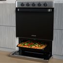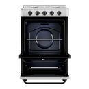 Cocina multigas de 56 cm. Color inoxidable. Puerta de horno con vidrio panorámico. Capacidad del horno: 74 litros. Cajón parrilla con puerta abatible. 2 parrillas superiores de alambrón. Válvula de seguridad. Encendido manual en horno y hornallas. Termocontrol en horno. Control frontal. Perillas plá...