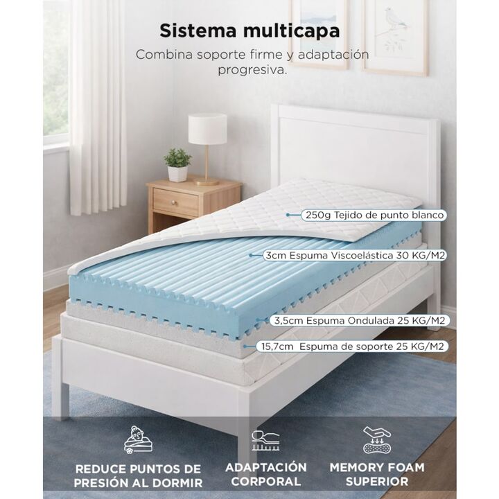 Confort equilibrado para un descanso diario: El colchón en caja Rieti by Gadnic combina espuma de soporte con una capa de memory foam que se adapta al cuerpo, brindando una sensación cómoda y estable desde la primera noche. Sistema multicapa que mejora la postura al dormir: Su estructura interna dis...