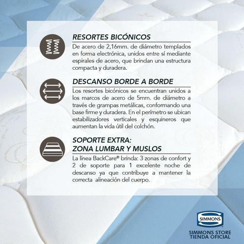 Colchón BackCare Hotel Bilt ¡Producto Exclusivo de MercadoLibre! INFORMACIÓN SOBRE LA LÍNEA Una línea especialmente diseñada para el cuidado de la espalda, brindando el soporte y confort que tu cuerpo necesita. Con el exclusivo BackCare Non-Flip, el primer sistema de descando patentado con 5 zonas d...
