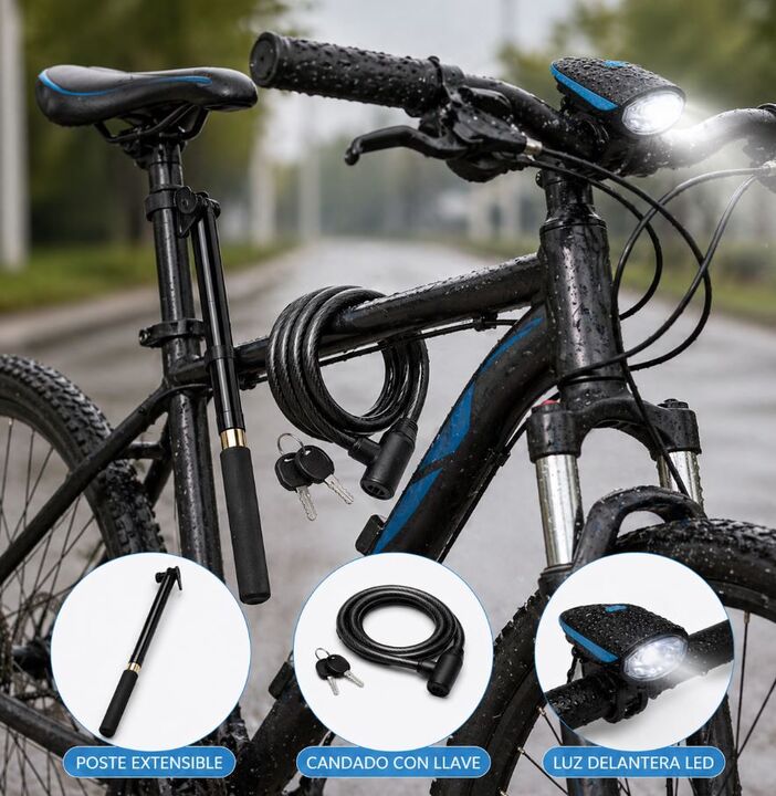 Equipá tu bicicleta con este práctico y funcional combo pensado para brindarte seguridad y comodidad en cada salida. Incluye una potente y práctica luz para la bicicicleta con bocina, recargable por usb. El combo se completa con un inflador portátil para bicicleta, compacto y fácil de transportar, ...