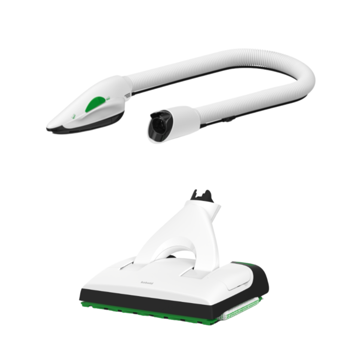 El combo incluye el Cepillo Aspira y Friega, que permite aspirar y fregar al mismo tiempo de forma inalámbrica. Está diseñado con dos canales de aspiración bidireccional y un depósito de agua extraíble para mayor comodidad.