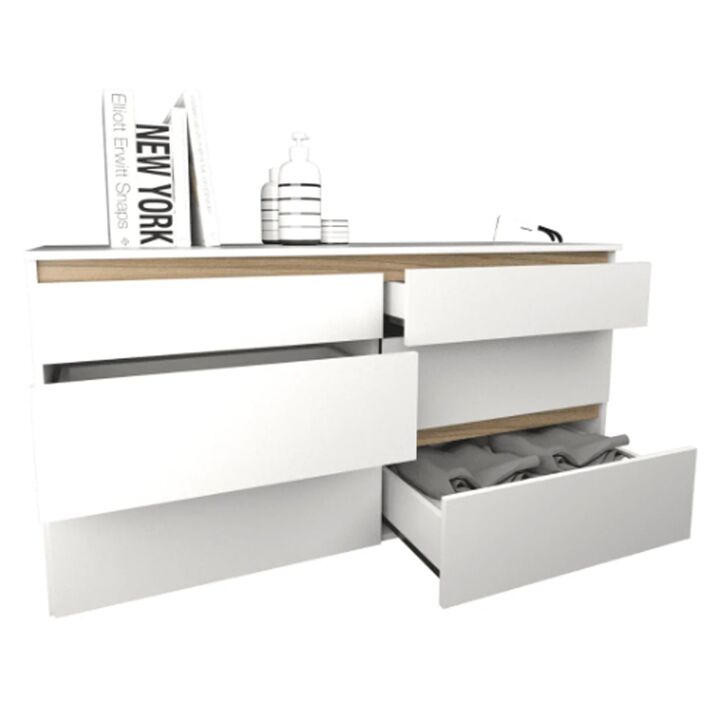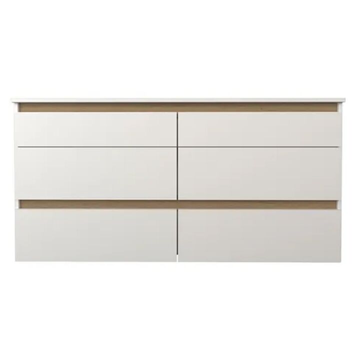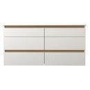 Cómoda de melamina de alta resistencia. Viene con dos regruesos de madera, el color de este regruesos es Olmo Finlandés. 4 Cajones de 63x20cm y 2 Cajones de 63x14cm con correderas metálicas. Interiores totalmente revestidos. Sistema Minifix. Medidas: Ancho: 1.28 mts. Alto: 0.67 mts. Profundidad: 0.4...