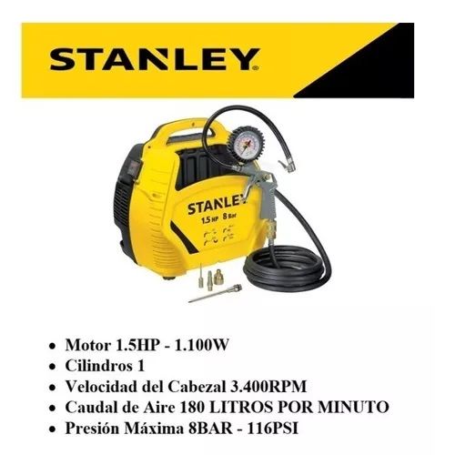 COMPRESOR DE AIRE PORTÁTIL STANLEY 8215190STC595 1.5HP 230V 8215190STC595_ Compresor sin aceite libre de mantenimiento Diseño ergonómico. Perfecto para trabajos de aficionados por su diseño ligero y compacto Practicidad: cuenta con un amplio compartimiento para guardar accesorios CARACTERÍSTICAS: • ...