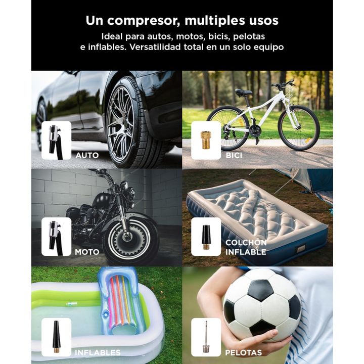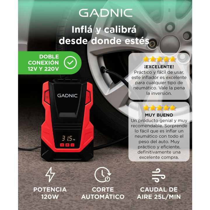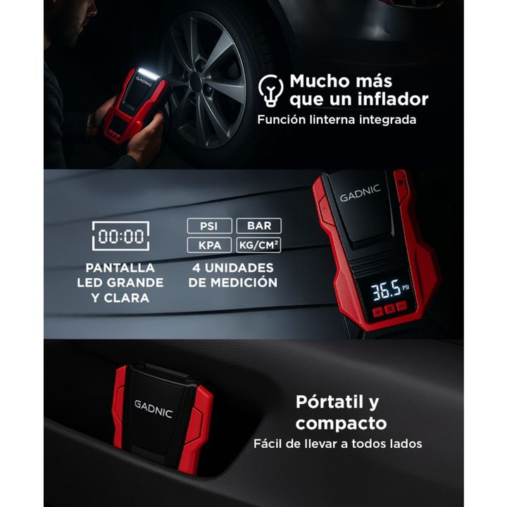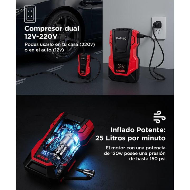 ¡Gadnic presenta su nuevo Compresor de aire Portatil 12V/220V! Alta presión e inflado rápido: el motor proporciona una compresión mejorada, lo que permite que salga una presión hasta 150 psi Apagado automático y función de memoria: el compresor de aire se apagará automáticamente cuando alcance la pr...