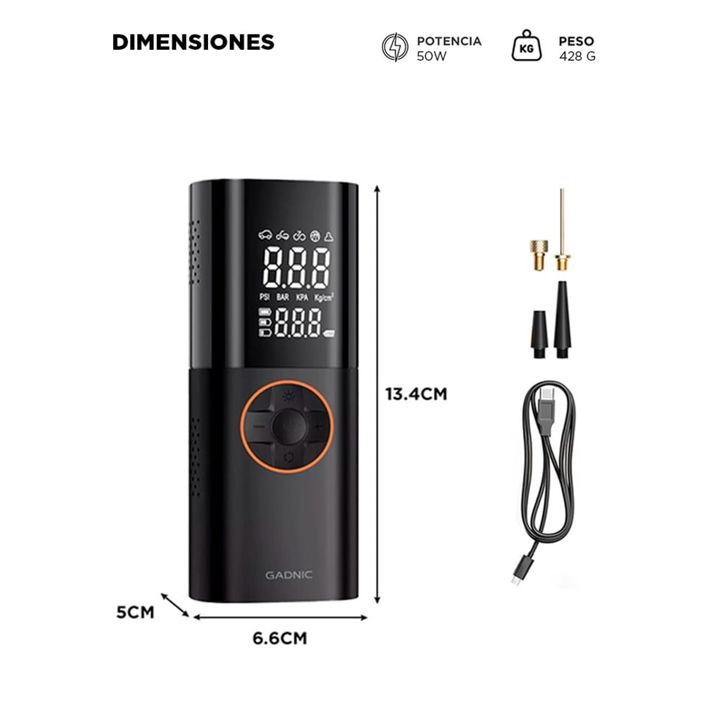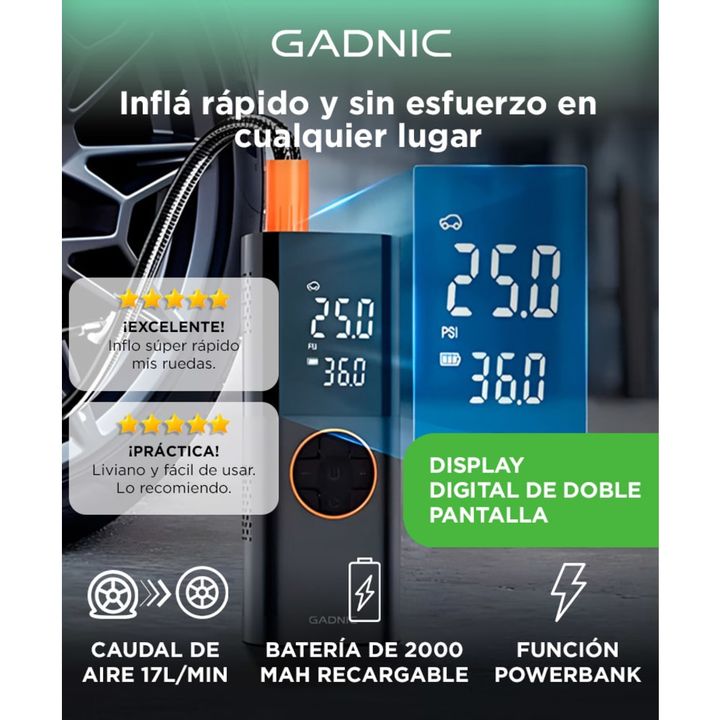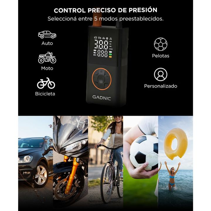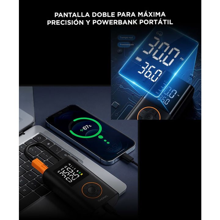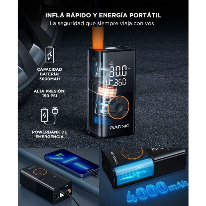 Gadnic presenta el nuevo Compresor de Aire Portátil: Inflado Rápido: Presión máxima de 150 PSI y flujo de aire de 17L/min. Infla una llanta de 25 a 36 PSI en 1 minuto. Pantalla Dual LCD: Muestra la presión en tiempo real y los valores preestablecidos con precisión ±0.5 PSI. Modos Preestablecidos: Cu...