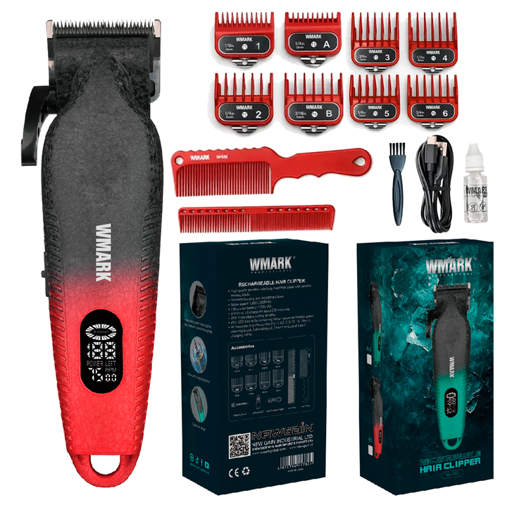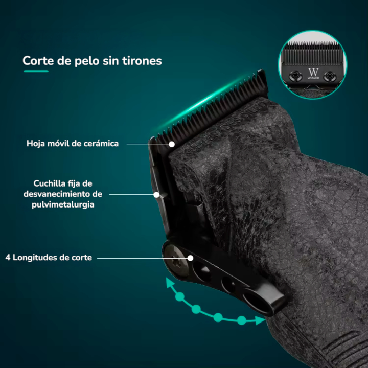 CORTADORA DE PELO INALAMBRICA WMARK - Cuchilla fija de alta calidad fabricada en pulvimetalurgia con cuchilla móvil de cerámica. - Carcasa y palanca de ajuste totalmente metálicas. - Velocidad del motor: 7500 RPM. - Batería de iones de litio: 2200 mAh. - Carga completa en 3-4 horas para unos 200 min...