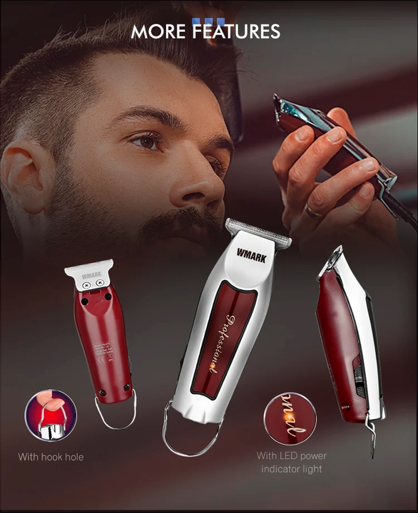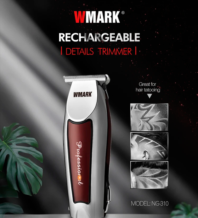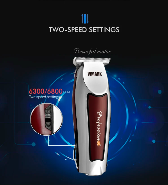 WMARK DETAIL TRIMMER TWO ROUND PIN PLUG SKU: NG-310 • Cuchillas de corte en T de acero inoxidable, con un espacio de aproximadamente 0,1mm. • Velocidad del motor: 6300/6800RPM. • Batería de litio: 900mAh. • 2,5 horas de carga completa para 150 minutos de uso. • Con luz LED indicadora de alimentación...
