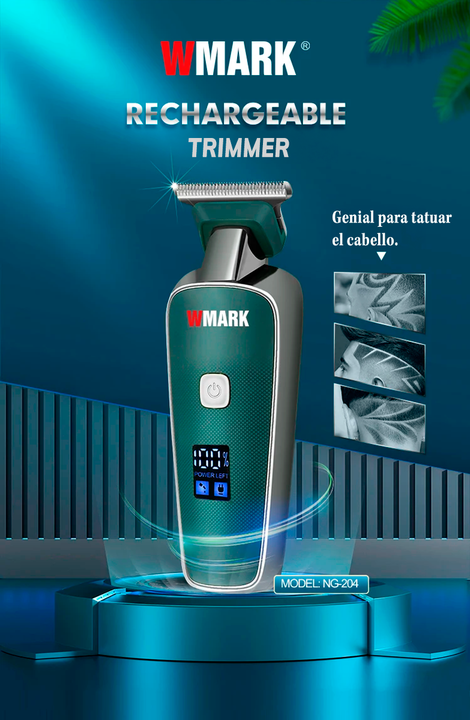 WMARK DETAIL TRIMMER CHARGED BY USB CABLE SKU NEGRA: NG-204 SKU VERDE: NG-204-GREEN • Cuchillas anchas de acero inoxidable estilo T de aproximadamente 0,1mm goteadas. • Con pantalla LED de batería restante. • Velocidad del Motor: 7000RPM • Batería de litio: 600mAh. • 2 horas de carga completa durant...