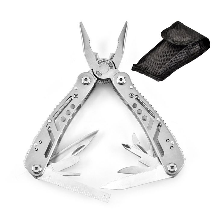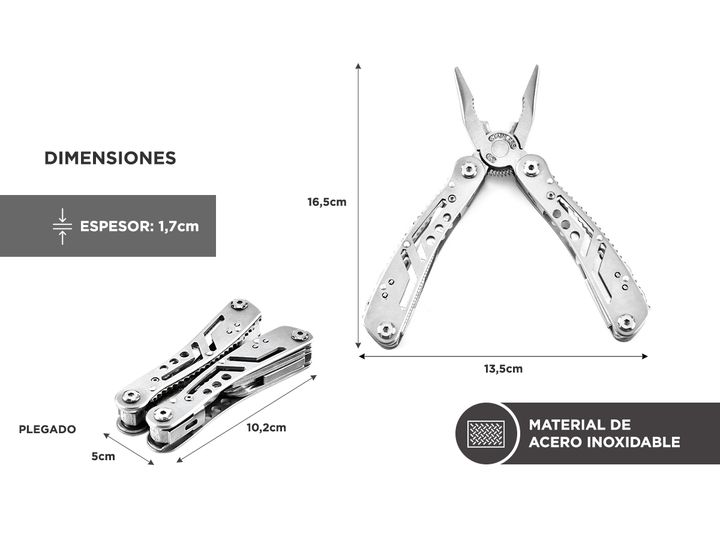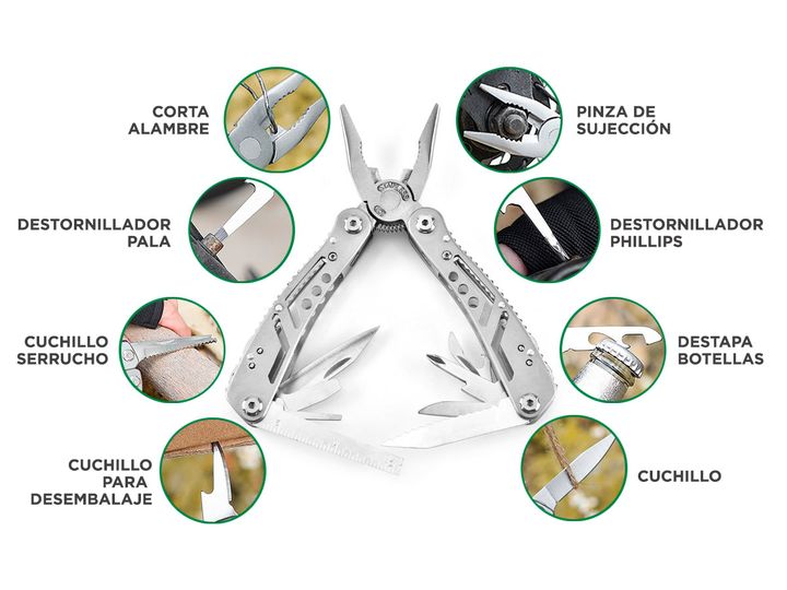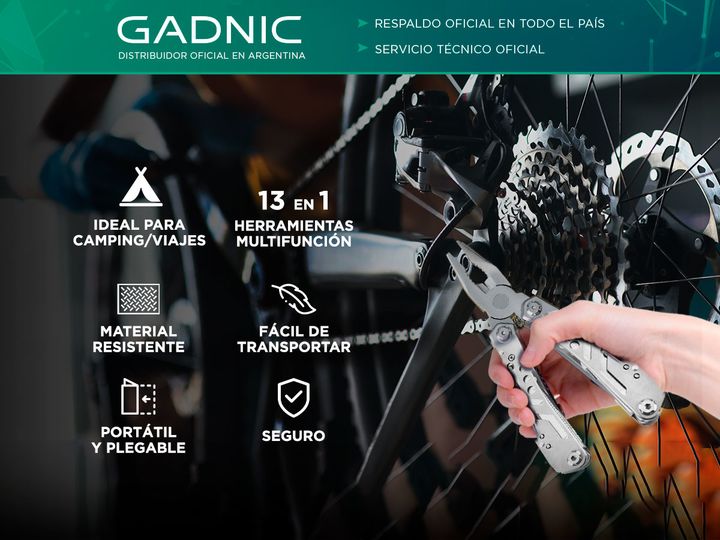 Nueva herramienta multifunción By Gadnic Este cuchillo transportable es ideal para solucionar 13 herramientas en 1. De acero inoxidable y terminaciones de alta calidad. Liviano y transportable No solo es funcional, por lo que no necesitaras otras herramientas, también incluye su propio estuche trans...