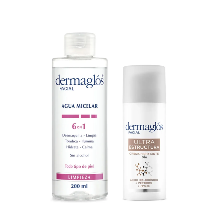 Componentes Dermaglos Facial Agua Miceral 6 En 1 Limpieza Ttp 200ml Código: 7793742007415 | SKU: 008091 x 1 uni Crema Dermaglos Ultra Estructura Hidratante de Dia Fps30 50g Código: 7793742108587 | SKU: 008140 x 1 uni
