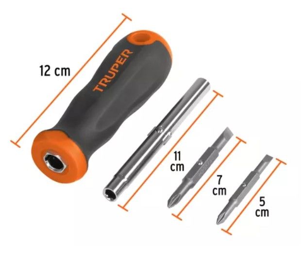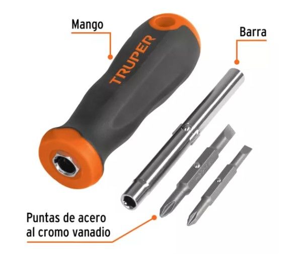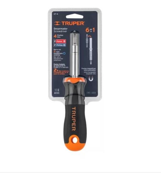 DESTORNILLADOR 4 EN 1 CON 2 PUNTAS ENC 1/4 HEXAGONAL TRUPER El desarmador cuenta con un mango de polipropileno, diseñado para proporcionar un agarre cómodo y seguro, permitiendo un manejo preciso durante su uso. Este material es conocido por su resistencia al desgaste, asegurando que el desarmador m...