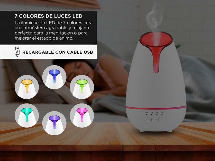 Disfruta de un ambiente relajante y lleno de bienestar con nuestro difusor de aceite. Con una potencia de 5W y una capacidad de agua de 120ml, este difusor compacto es perfecto para cualquier espacio. Su iluminación LED de 7 colores añade un toque de color y calma a tu entorno, mientras que su funci...