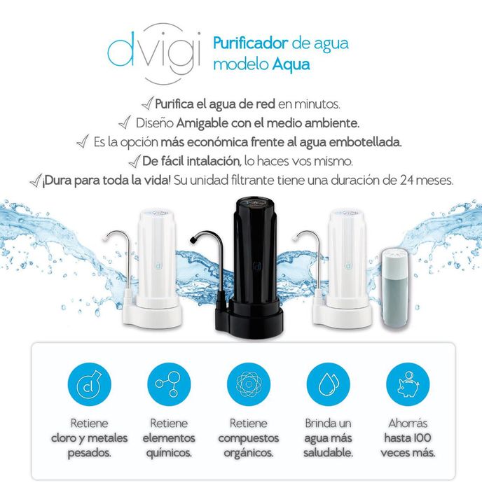 DVIGI PURIFICADOR AQUA AS ORO SKU: AQUASO0135 Descripción DVIGI AS PLUS Este producto es un dispositivo de acondicionamiento de agua de red domiciliaria. Beneficios: Retiene el 84,78% del Cloro (respecto a un agua de prueba con 2,91mg/l de cloro activo) Retiene más del 90% del arsénico del agua (res...