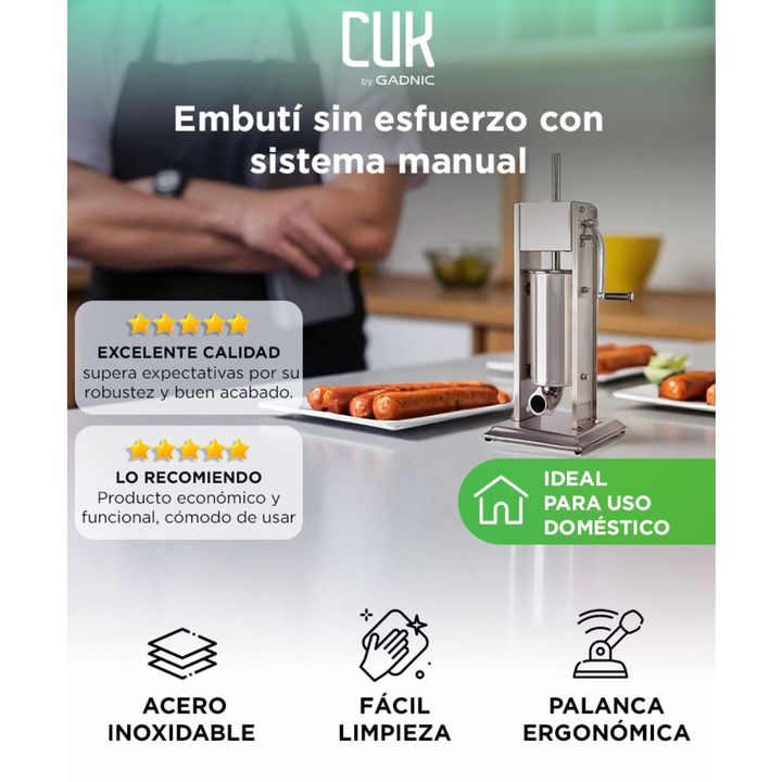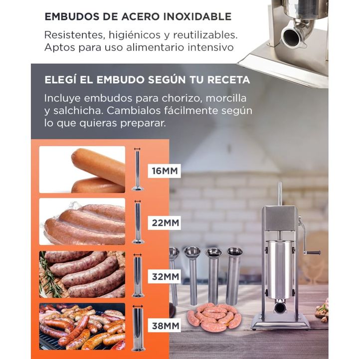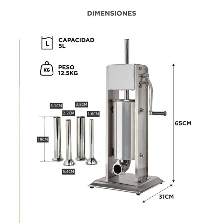 Crea tus propios embutidos; chorizo, morchilla o salchicha. Con la Embutidora Gadnic tienes la ventaja de poder condimentar tu embutido a tu gusto y armarlo de manera casera. Sorprende a tus amigos o familia con los mejor. Especificaciones Capacidad: 5 litros Capacidad de peso: 2,5 kg Material: Acer...