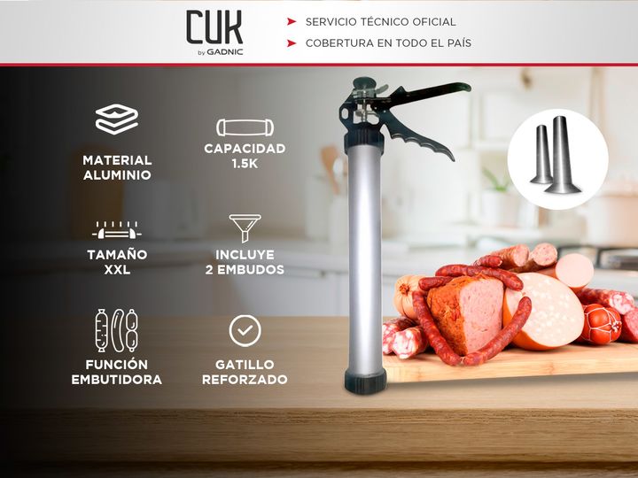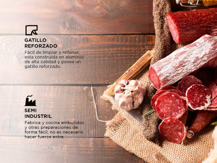 Gadnic presenta su nueva embutidora XXL. Su tamaño mas grande y dos embudos extra harán que el trabajo de preparar churros y otros embutidos sea fácil y rápido Materiales seguros y de alta durabilidad: Esta maquina es fácil de limpiar y rellenar, esta construida en aluminio de alta calidad y posee u...