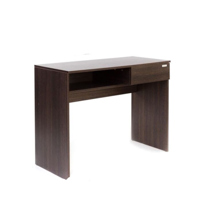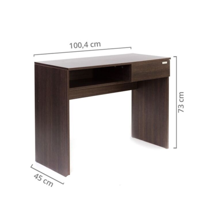 Escritorio de melamina para Notebook. Un cajón con correderas metálicas. Un estante inferior. Color Tabaco. Medidas: Ancho: 1.00 mts. Alto: 0.75 mts. Profundidad: 0.45 mts. Productos Seleccionado para venta y entrega “EN CAJA”.