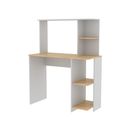 Escritorio de melamina con Alzada. Dos estantes en la parte inferior y un estante en la parte superior. 100% Melamina de 15 mm. Filos melamínicos. Color Blanco y Coco. Medidas: Alto: 1.30 mts. Ancho: 1.00 mts. Profundidad: 0.45 mts.