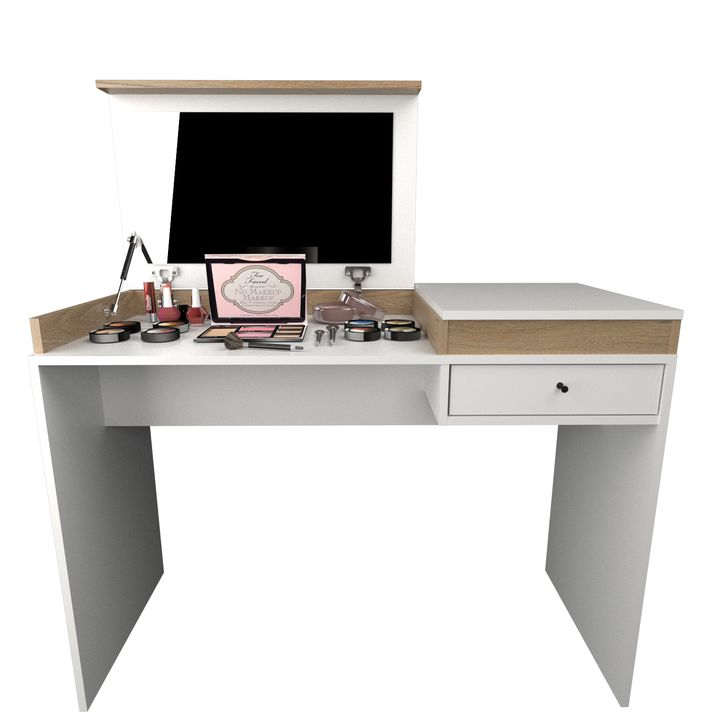 Escritorio maquillador de melamina de alta resistencia. Un cajón con correderas metálicas y tirador metálico Una puerta con bisagras metálicas y espacio de guardado. Tapa con espejo biselado, con bisagras metálicas y pistón neumático. Sistema Minifix. Medidas: Alto: 0.77 mts. Ancho: 1.01 mts. Profun...