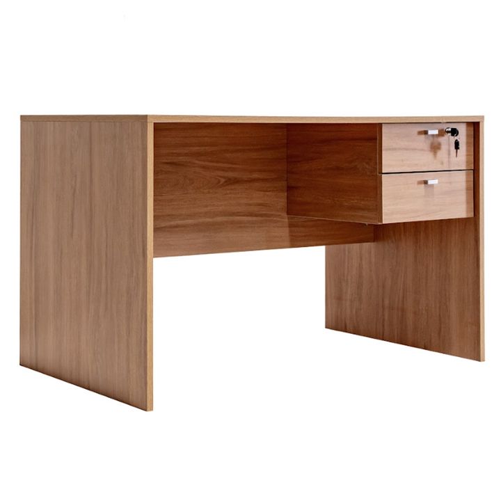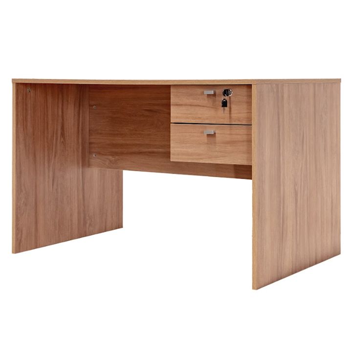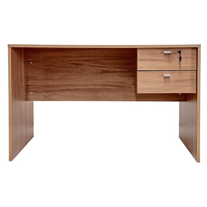 Escritorio Profesional para oficina de melamina. Dos cajones con correderas metálicas, uno de ellos, el superior, con cerradura, con la opción de armado con los cajones tanto del lado derecho como del lado izquierdo. Tiradores metálicos. Color Acacia. Medidas: Ancho: 1.20 mts. Alto: 0.74 mts. Profun...