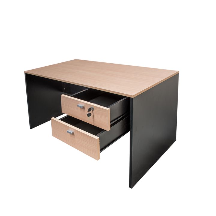 Escritorio Profesional para oficina de melamina. Dos cajones con correderas metálicas, uno de ellos, el superior, con cerradura, con la opción de armado con los cajones tanto del lado derecho como del lado izquierdo. Tiradores metálicos. Color Negro y Haya. Medidas: Ancho: 1.20 mts. Alto: 0.74 mts. ...