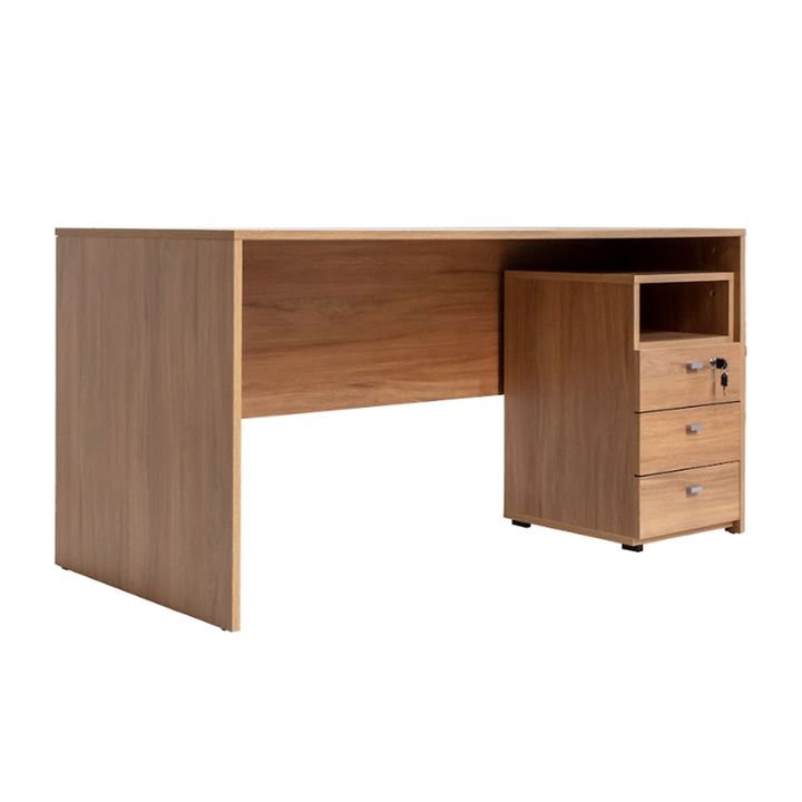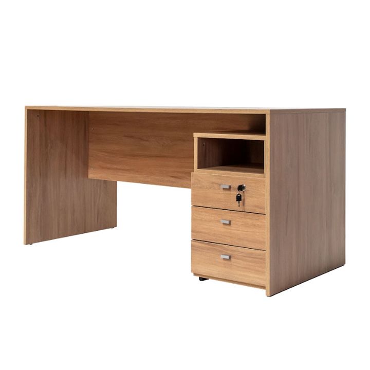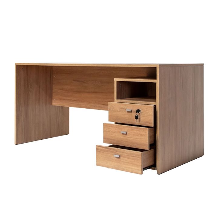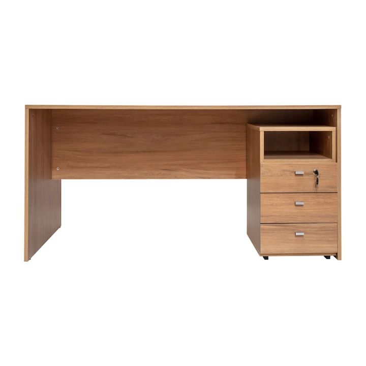 Escritorio Profesional para oficina de melamina. Cajonera móvil de tres cajones con correderas metálicas, uno de ellos, el superior, con cerradura. Tiradores metálicos. Color Acacia. Medidas: Ancho: 1.50 mts. Alto: 0.74 mts. Profundidad: 0.70 mts. Producto seleccionado para venta y entrega “EN CAJA”...