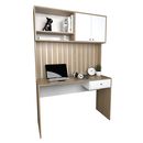Escritorio juvenil de melamina de alta resistencia. Alzada con doble puerta y sector superior abierto de guardado y librero. Fondo varillado. Un cajón con correderas metálicas. Tiradores metálicos. Bisagras metalicas. Alacena autoportante. Sistema Minifix. Medidas: Ancho: 1.15 mts. Alto total: 1.77 ...