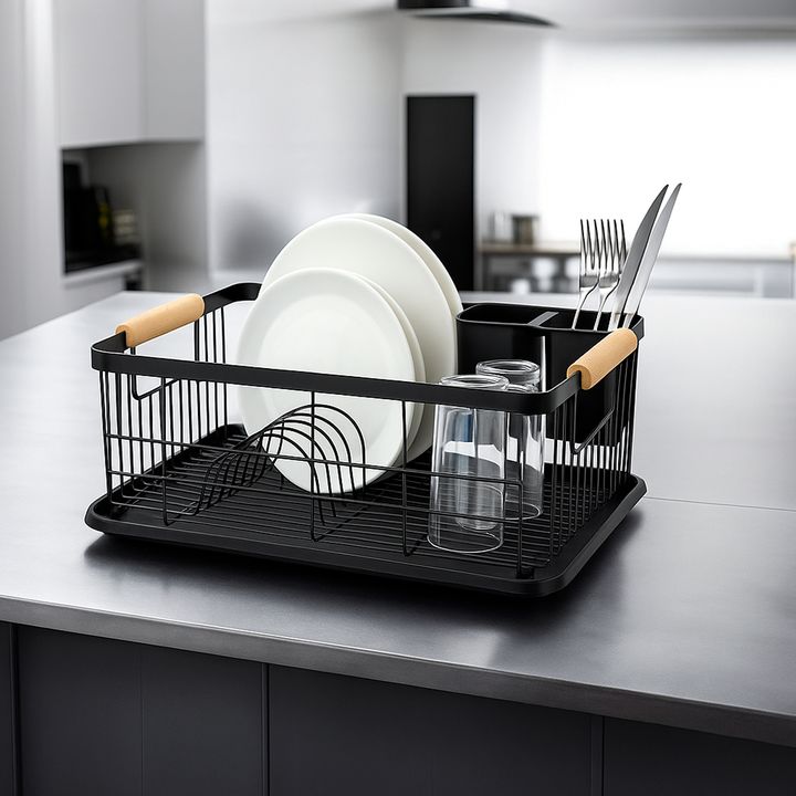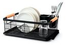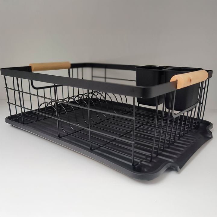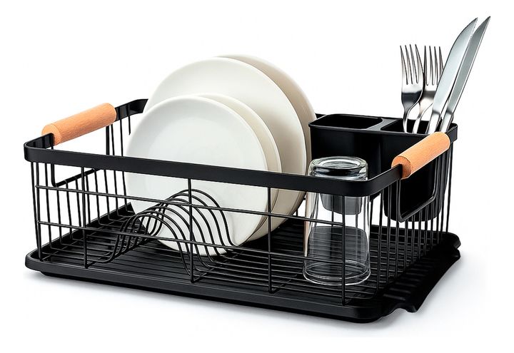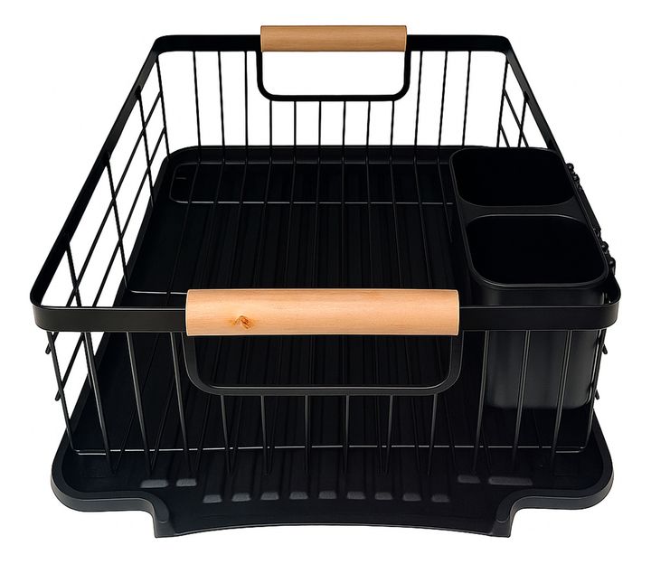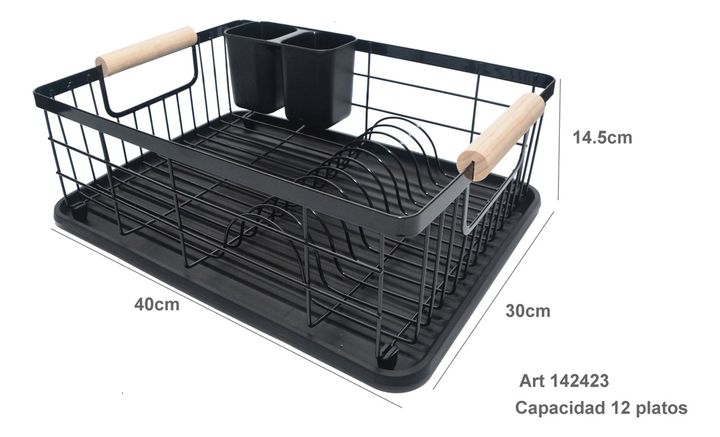 HOGAR ACTUAL ESCURREPLATOS NEGRO ACABADO MATE Y MANGO DE MADERA SKU: 142423-N ESCURREPLATOS ACERO PINTADO Y MADERA Color Negro Opaco Capacidad : 9 platos Con bandeja y cubiertero de PVC Medidas Escurreplatos: Ancho 32 cm Alto 17 cm Largo 50cm Medidas Incluyendo Manijas y Bandeja: Ancho 32 cm Alto 17...